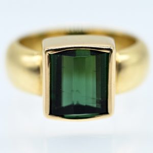 Goldener Ring mit grünem Turmalin, Goldschmiedearbeit NM, Hamburg, 21. Jh.1.500,00 €750/- yellow gold; total weight: approx. 14.5 g; vertically oriented rectangular high bezel setting with a stepped faceted green tourmaline; dimensions: approx. 10.2 x 9.1 mm; height: approx. 6 mm; wide, semi-arched plain shank; dimensions of ring head: approx. 12.2 x 10.9 mm; width of shank: approx. 7.2 mm; ring size: 56.
