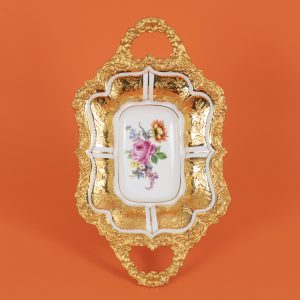 Prunkschale mit Handhaben ”Blumenbukett”, Meissen, Knopfschwerterzeit,1924-193490,00 €White porcelain with rich gilt bronze and burnished gold decoration and polychrome flower painting “bouquet” in the well; dished form, scalloped wide rim with rich floral relief decoration, two lateral handles; 1st quality and in good condition with age-related signs of wear as well as a flat underside rim chip and 2 minimal flat chips on the foot ring – inconspicuous in presentation; dimensions: approx. 35 × 20.5 cm; underglaze blue crossed swords mark of the knopfswords period (1924-1934), painter’s mark and impressed mark; weight: approx. 855 g.