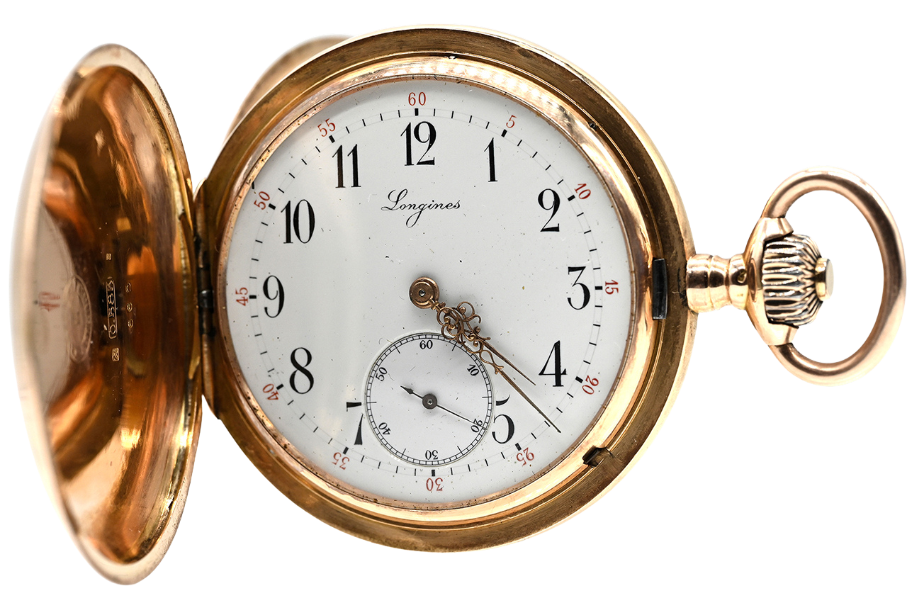 Goldene Savonette-Herrentaschenuhr, bez. Longines, erworben in Berlin 18992.500,00 €585/- rose gold including cover; total weight: approx. 109.1 g; serial number: 1´003´665; calibre: 19.58; manual winding; white enamel dial with black Arabic numerals and small seconds at 6 o’clock; gold-coloured filigree hands; manufacturer’s number: 1003665; front and back surfaces with fine engine-turned guilloché décor; front with elaborate, almost full-surface, intertwined monogram “HK”; written confirmation from Longines Switzerland stating that the pocket watch was purchased on 30 September 1899 at the former Berlin branch (copy of the letter included); diameter excluding crown and bow; movement starts; no guarantee on movement or function.