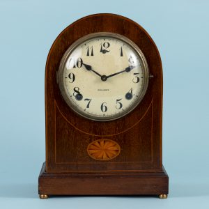 Antike Kaminuhr im edwardianischen Stil, um 190080,00 €Satinwood with mahogany inlays; raised on four compressed globular brass feet, rectangular recessed and profiled base; rectangular case with arched pediment; white enamel dial with black Arabic numeral index and blued hands; eight-day movement; signed Gilbert; rear access door; pendulum and winding key present, probably not original; dimensions of the outer case: 30.5 x 21.5 x 12 cm; age-related signs of wear; no guarantee for movement and functionality.