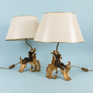 “Paar Tischlampen mit Rokoko Elementen und plastischen Putti im Stil des 18. Jh.”240,00 €Brass bronze with gilt and dark brown patina; volute-shaped base in Rococo style with sculptural putti seated on top; later electrification and a cream-coloured oval paper lampshade with gilt trim; overall height: approx. 52 cm, incl. lampshade; decorative dimensions: approx. 21 x 22 x 17 cm; one attribute in the hand of the putto presumably missing.
