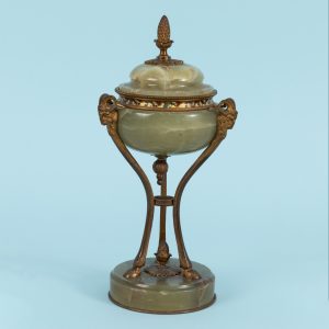 Ziergefäß aus grünem Onyx, Messingbronze und polychrome Cloisonné, 1. Hälfte 20. Jh.80,00 €Round green veined onyx base with lidded vessel; supported by three stylised goat legs with hooves and ram heads in brass bronze, as well as sculptural pinecones on the centre of the base, beneath the vessel and as the lid finial; polychrome ornamental cloisonné decoration along the rim; height: approx. 23.5 cm; base diameter: approx. 9.3 cm; various small edge chips.