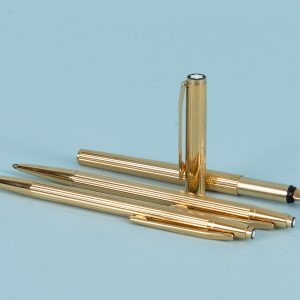 3er Set vergoldeter Stifte, Montblanc, Hamburg, 1970er–1980er Jahre90,00 €Metal gold-plated with 585/- yellow gold; three-piece set of writing instruments from the “Noblesse” series consisting of: 1) pair of ballpoint pens with fully fluted surface and high-set clip; shaft embossed around “MONTBLANC-NOBLESSE-GERMANY”; Montblanc emblem inlaid in the push button; length: approx. 13.9 cm. 2) fountain pen with fully fluted surface and removable cap with clip and inlaid Montblanc emblem as well as the imprint “MONTBLANC GERMANY”; broad nib stamped “585”; length: approx. 13.8 cm. 3) empty ink converter for fountain pen; length: approx. 7.6 cm. Set with guarantee documents and in the original Montblanc case; age-related signs of wear; total weight: approx. 154 g.