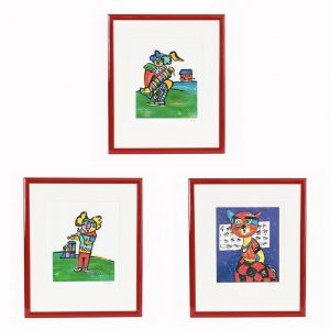 Alt, Otmar (*1940)3 prints (2 colour etchings and 1 colour lithograph); 2 colour etchings with clown motifs making music, each signed in pencil lower right “O. Alt” and numbered lower left “90/150” and “53/150”, image dimensions: each ca. 30 x 24.5 cm; 1 colour lithograph “Cat with music notes”, signed in pencil lower right “O. Alt” and numbered lower left “90/150”, image dimensions: ca. 30 x 25 cm; all 3 prints identically framed, under glass with Passepartout in red-lacquered wooden frame strips (one frame strip with minor surface scratches); frame dimensions: ca. 55.5 x 47 cm; total weight: ca. 6.3 kg.