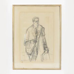 Edelmann, Hanno (1923-2013)Pencil on drawing paper; expressionist portrait painting; frontal three-quarter length view of a man in a suit holding a briefcase; signed and dated (19)60 lower left; chamois-coloured Passepartout; under glass; simple gilt frame with some losses; not opened; image section size: approx. 57 x 39 cm; frame size: approx. 76.5 x 57 cm; weight: approx. 3.7 kg.