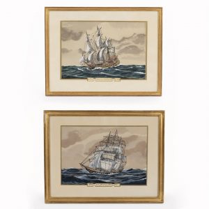 Gradassi, Jean (1907 – 1989)Two colour lithographs, heightened with white and bordered in gold on paper; maritime painting; two depictions of historic tall ship motifs on the high seas (each inscribed in French at the bottom “Goélette dans l’Atlantique-Nord en 1860” and “Navire de Guerre au Siècle du Grand Roy. 1680”); chamois-coloured passepartout; narrow gold-coloured frames; not examined out of frame; image dimensions: each approx. 21 x 30.5 cm; frame dimensions: approx. 33 x 43 cm and 32 x 42 cm; total weight: approx. 1.85 kg.