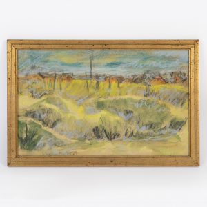 Skagen-Maler bezeichnet Heckel, 20. JahrhundertPastel and watercolour on paper; landscape painting with houses in a colourist concept; central perspective onto a row of rooftops behind a hilly meadow with posts; inscribed lower left “Skagen Heckel 09”; minor fraying at the sheet edges and traces of drawing pins; age-related signs of wear; behind glass; wooden frame; sheet size: approx. 25.3 x 40.8 cm.