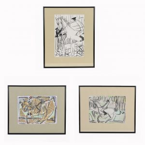 Homuth, Wilfried (*1940)3 polychrome collages, consisting of a mixed media on paper with an abstract depiction of a jockey on his horse leaning slightly forward, signed and dated lower left and lower right “W. Homuth 02”, a charcoal drawing on sketching paper with an abstract, monochrome depiction of a dressage rider in an arena on a horse being held at the head by another person, signed and dated in the center below “Homuth 2000”, and a work in chalk, pencil and watercolours on parchment paper with an abstract depiction of a dressage rider on his galloping horse in a field in front of a row of closely standing trees, with visible work traces, signed and dated lower left “W. Homuth 2000”. All with beige Passepartout, modern narrow black plastic frame, under glass, not opened; image section dimensions: ca. 29 x 38.6 cm; frame dimensions: ca. 51.3 x 61 cm; total weight: ca. 8.4 kg.