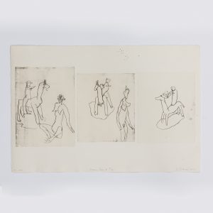 Klinge, Dietrich (*1954)Etching on paper; “Mann, Frau & Tier” from 1992; three print motifs on one sheet; abstract figures; depiction of three motifs with female and male figures and an animal with a long neck; numbered lower left “12:110(?)”, titled in the center, signed and dated on the right; sheet dimensions: ca. 53.5 x 35.6 cm; some dark pinpoint stains at the upper edge and age-related signs of wear.