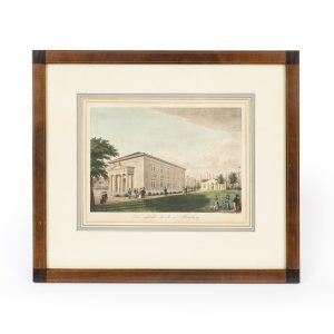 Hand-coloured lithograph on paper; Hamburgensie “Die Englische Kirche in Hamburg” (The English Church in Hamburg); side view of the English church and surrounding gardens with staffage figures; minor foxing; mounted in a passepartout; image dimensions: approx. 23 x 33 cm; passepartout dimensions: approx. 26.5 x 35 cm. -