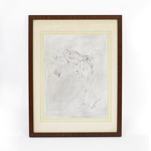 Unbekannter Künstler, Mitte 20. JahrhundertPencil on paper; realistic sketch; depiction of a man dressed in a kind of uniform, leaning forward in a bowing gesture, with one hand held behind his back; surrounded by two additional sketches of hands; unidentified inscription lower right, possibly a signature; chamois-coloured passepartout with green and violet borders, discoloured with age; behind glass; narrow brown wooden frame with black accents; image section dimensions: approx. 28.8 x 22 cm; frame dimensions: approx. 42 x 32.3 cm; weight: approx. 0.9 kg.