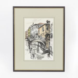 Colour lithograph; landscape painting; pen drawing coloured with watercolour; view from the pavement onto the Venetian bridge Ponte de l’Ospedaletto with surrounding houses; lower left monogrammed “OE”? and dated (19)90; grey Passepartout behind glass; narrow brown wooden frame with golden edging; not opened; image section dimensions: approx. 39.5 x 27.5 cm; frame dimensions: approx. 62 x 50 cm; weight: approx. 2.7 kg.
