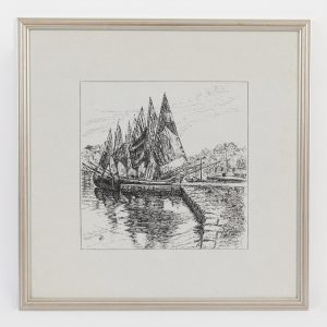 Unbekannter Künstler, 20. JahrhundertMonochrome print on paper; harbour view depicting sailing ships docking at the shore in front of a village; monogrammed lower left “OE” and dated “(19)90”; bordered square format; under glass; silver-coloured wooden frame; reverse of the frame sealed with wax stamp; not opened; age-related signs of wear; image section dimensions: ca. 39.7 x 39.7 cm; frame dimensions: ca. 43.5 x 43.5 cm; weight: ca. 1.7 kg.
