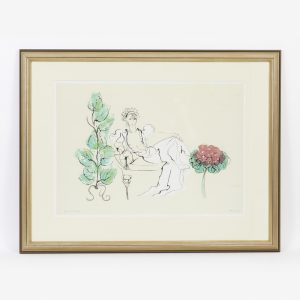 Unbekannter Künstler, 20. JahrhundertColour lithograph on paper; coloured line art; depiction of a lady reclining on a Récamière in a white gown with a bare upper body, flanked by two floral elements; signed illegibly lower right, inscribed lower left; under glass; modern gilt frame; not opened; sheet size: approx. 46.5 x 66.6 cm; frame size: approx. 95 x 75 cm; weight: approx. 7.6 kg; shipping exclusively by forwarding agent or at the buyer’s risk.