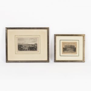 Zwei kleine Drucke, 20. JahrhundertMonochrome prints on paper; landscape views with architectural staffage, consisting of a depiction of the Roman amphitheatre of Pula in Croatia, titled in the centre “POLA” and inscribed lower left with the name of the printing house, in a wide Passepartout with gilt edging, under glass, in a simple gilt frame, not opened, image section dimensions: ca. 9 x 11 cm, frame dimensions: ca. 20.5 x 22.8 cm, together with a depiction of the ancient Italian city of Baiae, titled in the centre “BAY OF BAIÆ”, inscribed lower left “Drawn by J. D. Harding”, lower right “Engraved by J. C. Varrall” and with the name of the printing house, in a wide Passepartout with gilt edging, under glass, in a simple gilt frame, not opened, image section dimensions: ca. 11 x 16 cm, frame dimensions: ca. 25.5 x 31.7 cm; total weight: ca. 880 g.