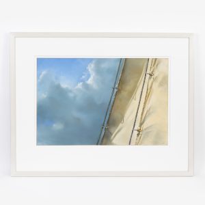Volquardsen, Astrid (*1969)Pastel on thin artist’s board; “Unter Segeln (IV)” from 2010; naturalistic maritime painting; section of a sunlit ship’s sail billowing in the wind under a blue sky with breaking clouds; signed lower right; reverse with adhesive label containing information from the artist and handwritten numbering; white Passepartout; under museum glass; not opened; modern white wooden frame; image size: approx. 50 x 75 cm; frame size: approx. 83 x 105 cm; weight: approx. 8.5 kg.