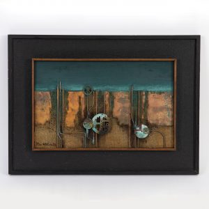 Wilhelm, Theo (1912 – 2005)Multimedia on wood; metal collage from 1974; three-dimensional abstract collage in a complementary colour concept; heterogeneous materials (textile, paint, copper wire, metallic elements, gears) form a dense, relief-like image structure reminiscent of a stylised mechanical system; signed and dated lower right; collage mounted on an additional frame; on the reverse, a booklet with works by the artist and a note with dedication, both affixed; not opened; collage dimensions: approx. 24.2 x 38.2 cm; frame dimensions: approx. 37 x 51 cm; weight: approx. 1.5 kg.
