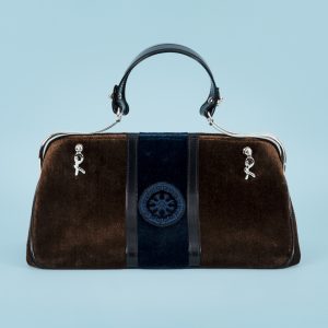 Abendtasche aus Samt, Roberta di Camerino, Venedig, Italien, 2. Hälfte 20. Jahrhundert450,00 €Dark blue and brown velvet and smooth leather with silver-toned hardware; four pendants with the characteristic R monogram; leather lining with two side interior pockets, one with zip closure; frame closure with double leather handles; embossed logo on a small leather tag inside; impressions from the frame closure on the velvet; dimensions (excluding handles): approx. 17 x 30.2 x 13.5 cm; weight: approx. 770 g.