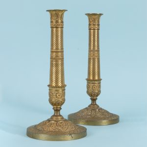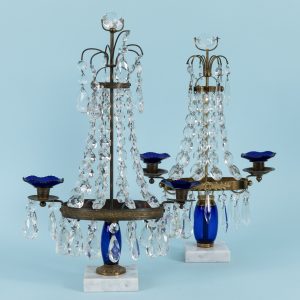 Paar Tischleuchter mit Kristallbehang, im gustavianischen Stil, Schweden, 20. Jh.180,00 €Two different models; square plinths of white marble with grey veining; blue baluster-shaped glass shafts; gilt, ornamentally decorated mounts and candle nozzles; rich crystal drop decoration in round, icicle- and drop-shaped faceted forms; height: approx. 38.5 cm and 41 cm; age-related signs of wear.