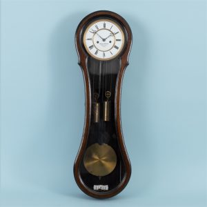 Regulator, Deutsch, Berlin, Conrad Felsing, Mitte 19. Jh.180,00 €Elongated mahogany-coloured case in stylised violin-case form; glazed, hinged front; white circular enamel dial with black Roman numerals and black ornamentally pierced hands; dial signed: Conrad Felsing, court clockmaker, Berlin, Germany; pendulum, weights and winding key present; dial with a fine, elongated hairline crack; wooden case with age-related signs of wear; height: 81.5 cm; width at the upper and lower sections: approx. 24.5 cm and at the centre: approx. 16 cm; movement untested; no guarantee for movement or functionality.