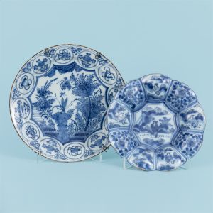 Kleiner Buckelteller und Fayenceteller, Holland, 17. Jahrhundert120,00 €Faience with white glaze and blue painting; 1) small plate with nine-lobed rim and well, the well decorated with a chinoiserie scene, the bosses alternating with floral painting and chinoiserie decoration corresponding to the rim; along the rim several chips; on the reverse and on the rim fine hairline cracks, various glaze losses; diameter: approx. 25.3 cm. 2) round faience plate with twelve cartouches on the flared rim and a depiction with an insect and floral embellishment in the well; restoration of approx. 1.5 cm in the well and several chips along the rim; on the reverse ornamental painting and a glaze loss of approx. 12 mm, as well as an old adhesive label; wire wall suspension on the reverse; diameter: approx. 31 cm. Total weight: approx. 1.4 kg.