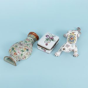 Konvolut Fayence-Vasen und Dose, 20. Jh.40,00 €Faience and white porcelain with polychrome decoration; 1) flat wall vase in vase form with fine floral and ornamental decoration, chip to the lower base measuring 5.5 cm; length: approx. 20.4 cm. 2) wall vase in the form of a stylised cat with fine floral decoration; numbered on the underside; length: approx. 24.4 cm. 3) rectangular box with hinged lid, metal mounts and handle in Rocaille style; floral decoration running around the sides and on the lid; several hairline cracks to the interior; dimensions: approx. 4.5 x 9.5 x 8 cm.