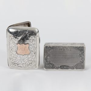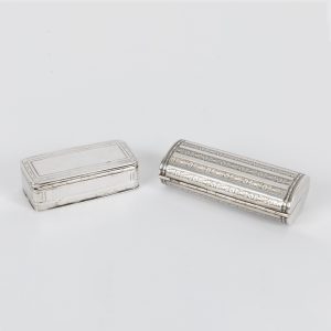 Zwei silberne Dosen mit Gravurdekor, Deutschland, frühes und spätes 19. Jh.130,00 €900/- and 13-lot silver; total weight: approx. 169 g; 1) Small rounded-elongated box with hinged lid, reeded ornamental decoration and raised thumb rest; interior with minimal remnants of gilding; rim stamped with an unidentified maker’s mark and fineness mark 13; dimensions: approx. 1.9 x 7 x 3.2 cm. 2) Vanity case of elongated oval form, encircling floral and ornamental decoration to the front, thumb press; interior divided into two compartments with separate lids, upper section separated by a bar; thumb-rest hinge made of metal (partially rusted); interior hinge stamped with crescent and crown, fineness mark 900 and unidentified maker’s mark; opening stiff; dimensions: approx. 2 x 8.5 x 3.5 cm. Both boxes with age-related signs of wear.