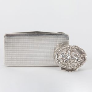 Zwei Dosen aus Silber, 20. Jahrhundert60,00 €925/- and 900/- silver; total weight: approx. 70 g; 1) Small oval box with encircling relief floral and vine-leaf decoration to the body and putti decoration to the lid; scrolled thumb rest; interior gilt; underside stamped with several unidentified punches, a British date letter and fineness mark “9125”; dimensions: approx. 3.8 x 2.8 cm. 2) Flat rectangular lidded box with chequered engraved decoration to the front, and two scrolled thumb rests to the sides; interior with remnants of gilding and engraved inscription “10.2.36 KARL”; several small nicks of approx. 1-3 mm in length; inner flange stamped with crescent and crown, unidentified maker’s mark and fineness mark; dimensions: approx. 7.9 x 4.2 cm. Age-related signs of wear and oxidation residues.