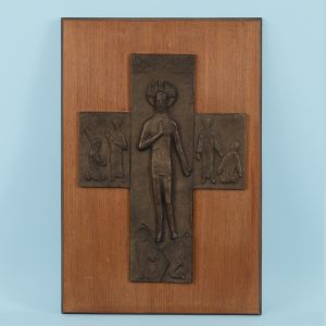 Bronze, brown patinated, mounted on a rectangular wooden plaque; crucifix structured like a triptych, with a semi-sculptural depiction of Jesus beneath the inscription “Ich lebe ihr sollt auch leben” (“I live you also shall live”), and below that a probable depiction of his resurrection in the center, flanked by two scenes from the life of Jesus Christ on the left and right; groove on the reverse for hanging, as well as two holes with wire cables fastening the bronze to the wooden plaque under loose adhesive strips; the connection between relief and wood is slightly loosened; some water stains and chipping on the wooden plaque; age-related signs of wear; dimensions of bronze relief: approx. 43.7 x 31.3 cm; dimensions of wooden plaque: approx. 57.5 x 38.5 cm; total weight: approx. 5.12 kg.