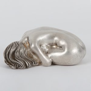 Solid silver casting (999/- fine silver); sculpture circa 2017; female reclining nude; oxidation residues and minimal age-related signs of wear; underside with artist’s stamp and fineness mark; length: approx. 10 cm.