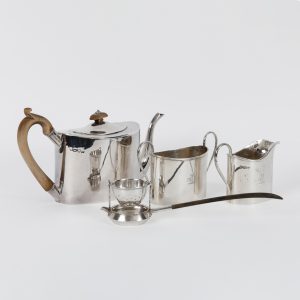 4-teiliges antikes Teeservice, George Nathan & Ridley Hayes, Chester, England, um 1910 und Koch & Bergfeld, Bremen, Mitte 19. Jh.520,00 €925/- silver; total weight: approx. 784 g; 3-piece tea service with elliptical corpus and straight walls, on the front side engraved depiction of a rearing bull from the middle of the body; laterally stamped with Lion Passant, city mark as well as maker’s mark and date letters L (1985) and M (1985) (partly rubbed): 1) teapot with low-set spout, ear-shaped handle and hinged lid with wooden handle; diagonally mounted wooden finial; height: approx. 13.3 cm. 2) sugar bowl with handles on both sides; height: approx. 9.5 cm. 3) cream jug with wide, curved spout; height: approx. 9.3 cm. 4) semi-ovoid swivelling tea strainer with drip bowl below and small spout on a long wooden handle; underside marked with fineness mark, crescent and crown as well as maker’s mark; age-related signs of wear and minor dents; all parts with age-related signs of wear, some with dents of approx. 1 mm and superficial scratches.