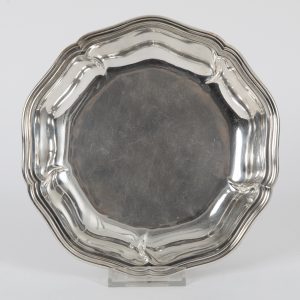 12 silberne Platzteller mit Heraldik, Otto Wolter, Schwäbisch Gmünd, 20. Jh.5.800,00 €925/- silver; total weight: approx. 6870 g; 12-piece set of six-lobed charger plates in Chippendale style with stepped rim and engraved unidentified family coat of arms in the centre; underside at the rim marked with crescent and crown, maker’s mark and fineness mark; tarnish-protected; age-related signs of wear and visible wear to the tarnish protection; diameter: approx. 30.2 cm.