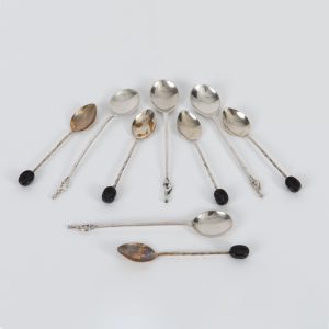 9-tlg. Konvolut silberne Mokkalöffel, u. a. A J Bailey & Son, Birmingham, England, 20. Jh.20,00 €900/- and 925/- silver; total weight: approx. 52 g; nine-piece set of mocha spoons: 1) five spoons with curved handles and stylised coffee bean made of Bakelite at the end of the handle, reverse of handle with fineness mark and unidentified maker’s mark; length: approx. 9 cm. 2) four spoons with handle ends in the form of a stylised cat, reverse of the bowl stamped with Lion Passant, city mark, maker’s mark and date letters (2x “D” for 1978 and 2x “A” for 1975); length: approx. 11.1 cm. All spoons with age-related signs of wear.