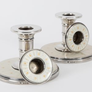 Paar Silberleuchter mit feiner Guilloche-Gravur, Albert Carter, Birmingham, England, 1924180,00 €Sterling silver: Total weight: approx. 490 g (filled); pair of antique table candlesticks on a wide circular base with guilloche engraving in shimmering cream- and grey-toned enamel with gilt fleur-de-lis décor, tapered triple-fluted shaft and removable nozzle with guilloche décor corresponding to the base; underside closed with a Bakelite plate; stamped on the side of the base ring and on the underside of the nozzle with lion passant, city mark, maker’s mark and date letter; enamel chip of approx. 1.5 cm on one removable nozzle as well as minor material flaws and age-related signs of wear; height: approx. 7 cm.