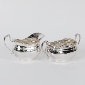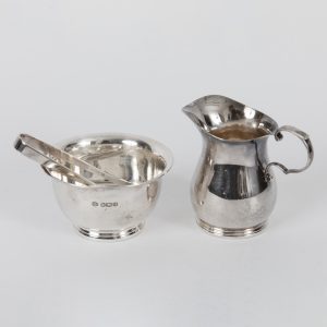 Silberne Zuckerschale und Rahmgießer, Viners Ltd, Edward Viner, Sheffield, England, 1933440,00 €Sterling silver; total weight: approx. 450 g; assortment consisting of: 1) Cream jug on an oval base with bulbous wall, slightly tapered neck and shaped rim with wide spout and volute handle; stamped on the side of the wall with lion passant, city mark, maker’s mark and date letter, numbered on the underside; height: approx. 9.2 cm. 2) Sugar bowl with bulbous wall and volute handles on both sides on an oval base; stamped on the side of the wall with lion passant, city mark, maker’s mark and date letter, numbered on the underside; height: approx. 7.8 cm. Age-related signs of wear.