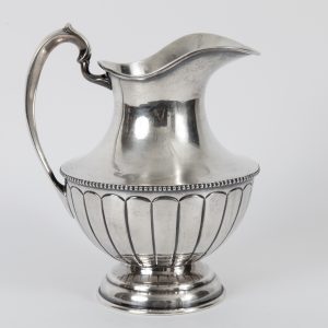 Silberner Wasserkrug, Mexiko, 1. Hälfte 20. Jahrhundert950,00 €925/- silver; weight: approx. 1297 g; silver water jug on a round, stepped, convex base with bulbous, fully gadrooned wall accented with a continuous beaded frieze, sharply tapered neck, wide spout and large J-handle; stamped on the underside with fineness mark, numbering, unidentified maker’s and jeweller’s marks as well as a distorted punch; age-related signs of wear and oxidation residues; height: approx. 26.2 cm.