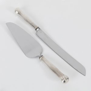 2-teiliges Tortenservierset, Dekor „Lotus“, Tiffany & Co., New York, USA, 2. Hälfte 20. Jahrhundert30,00 €Handles in sterling; total weight: approx. 208 g; cake knife and cake server with slightly curved, fluted handles featuring lotus blossom decoration at the end; stamped on the reverse of the handle with jeweller’s mark and fineness mark, and stamped with the jeweller’s mark on the blades; age-related signs of wear; length of the knife: approx. 32 cm; length of the server: approx. 27.5 cm.