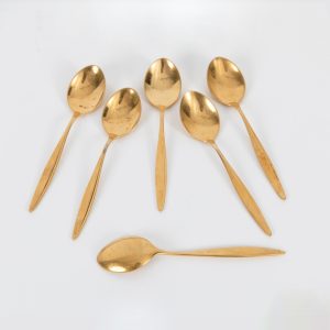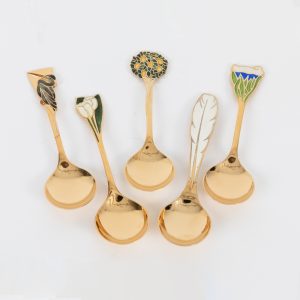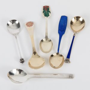 7 verschiedene Jahreslöffel, Robbe & Berking, Flensburg, 1988–1999560,00 €925/- sterling silver, gilt; total weight: approx. 469 g; spoons with round bowls, slender stems and individual designs outlined in polychrome enamel; group consisting of the annual spoons 1988 with lily-of-the-valley motif, 1989 with stylised tree, 1990 with bird motif, 1991 with floral decoration, 1992 with peacock motif, 1998 with butterfly motif and 1999 with sunflower motif; all spoons stamped on the reverse with crescent and crown, maker’s mark, fineness mark and numbering; the respective year stamped at the end of the handle; length: approx. 17.3 to 17.6 cm.