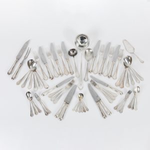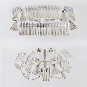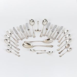 Großes Silberbesteckkonvolut „Friederike“, BSF und Wilkens & Söhne, Bremen, 20. Jh.4.800,00 €800/- silver; total weight: approx. 5 kg; 159-piece group with various monograms (“G”, “JR”, “JG”, “JH”, “FR”, “JS”) to the ends of the handles, comprising: 15 table knives (L: approx. 25.5 cm), 15 menu knives (L: approx. 21.4 cm), compote spoons (L: approx. 8.8 cm), bouillon spoons (L: approx. 13.5 cm), menu spoons (L: approx. 18.5 cm), cake server (L: approx. 21.8 cm), pair of sugar tongs (L: approx. 10.6 cm), pair of serving forks (L: approx. 19 cm), pastry server (L: approx. 17 cm), cake knife (L: approx. 27.3 cm), 3 ladles (L: approx. 21.4 cm), large serving spoon (L: approx. 27.8 cm), 3 ladles (L: approx. 18.5 cm), 6 ice-cream spoons (L: approx. 13.3 cm), 10 coffee spoons (L: approx. 13.7 cm), 17 teaspoons (L: approx. 12.4 cm), 16 cake forks (L: approx. 14.5 cm), 15 soup cup spoons (L: approx. 15.4 cm), 6 side knives (L: approx. 17.5 cm), 4 fish knives (L: approx. 22 cm), 4 fish forks (L: approx. 18 cm), 18 table forks (L: approx. 21.4 cm), 16 table spoons (L: approx. 21.7 cm); some pieces with engraved inscriptions to the reverse; all pieces stamped to the reverse with crescent and crown, maker’s marks of Wilkens & Söhne or BSF, fineness marks and some with retailer’s marks, incl. Watty; age-related signs of wear, minor deformations and oxidation residues; five knives require re-cementing.