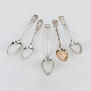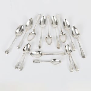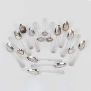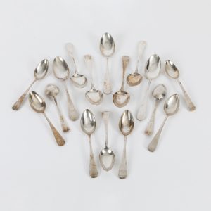 15-teiliges Konvolut verschiedener silberner Dessert- und Teelöffel, London, England, um 1800 – 1890er180,00 €Sterling silver; total weight: approx. 500 g; assemblage of 10 dessert and 5 teaspoons, partly with fiddle pattern, Old English pattern and various ornithological engravings at the end of the handle; stamped on the reverse with lion passant, duty mark, London town mark, date letters (1790s-1880s) and maker’s marks (Thomas Blake, 4 x William Chawner II, 2 x Thomas Dicks, 2 x William Eley, William Fearn & William Chawner II, 2 x William Eley & William Fearn, Thomas Shepard and George Aldwinckle (one hallmark is indistinct)); age-related signs of wear; length: from approx. 13.8 cm to approx. 17.7 cm.