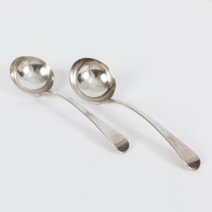 Zwei silberne Saucenlöffel, London, England, 1. Hälfte 19. Jahrhundert120,00 €Sterling silver; total weight: approx. 131 g; two sauce ladles with heraldic engraving at the end of the handle; stamped on the reverse of the handle with lion passant, date letters (1824 and 1826), London town mark and struck maker’s mark, one with duty mark; age-related signs of wear; length: approx. 17.7 cm and 18.4 cm.