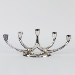5-armiger Silberleuchter, Gottlieb Kurz, Schwäbisch Gmünd, 20. Jahrhundert180,00 €925 silver; total weight: approx. 682 g (weighted); candelabrum with five undulating arms arranged side by side, each with bell-shaped sockets, on a slightly domed oval base; stamped on the side of the base with crescent and crown, manufacturer’s mark and fineness mark; age-related signs of wear; dimensions: approx. 16.3 x 40 x 9.5 cm.