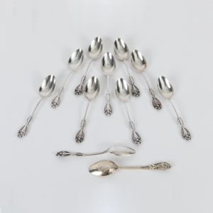 11 Espressolöffel mit aufwendigem durchbrochenem Dekor, Koch & Bergfeld, Bremen, um 1900180,00 €800/- silver; total weight: approx. 130 g; eleven silver espresso spoons, ten with pierced ornamental and fruit decoration at the terminal and one with acanthus leaf decoration at the terminal and on the reverse of the bowls; stamped on the reverse of the bowl with crescent and crown, maker’s mark and fineness mark; age-related signs of wear; length: approx. 10.7 cm.