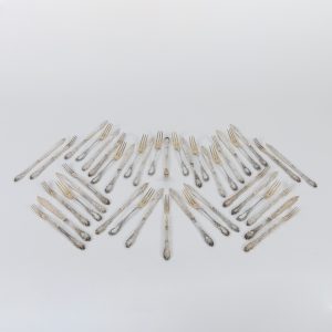 52-teiliges Konvolut feines Silberbesteck, Wilkens & Söhne, Bremen, um 19001.600,00 €800/- silver; total weight: approx. 1.15 kg; 52-piece cutlery assemblage consisting of: 1) 18 side knives in two different designs with raised Rococo and floral decoration on the handles, as well as an alloyed monogram “DME” at the handle terminal and finely chased ornamental and floral decoration on the blades; stamped on the reverse of the blades with crescent and crown, maker’s mark and fineness mark; length: approx. 17.3 cm. 2) 24 fruit forks in two different designs of 12 pieces each, with raised Rococo and floral decoration on the handles as well as an alloyed monogram “DME” at the handle terminal and finely chased ornamental and floral decoration on the bowls, and 12 with raised floral and ornamental decoration on the handles and finely chased ornamental decoration on the gilded bowls; stamped on the reverse at the junction of the bowl with crescent and crown, maker’s mark and fineness mark; length: approx. 16.2 cm and 14.2 cm; few age-related signs of wear and traces of oxidation.