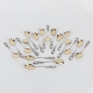 18 Eislöffel mit durchbrochenem Dekor, Wilkens & Söhne, Bremen, um 1900380,00 €800/- silver, total weight: approx. 364 g; 13 silver spoons with gilded bowls, filigree stems and pierced Rococo decoration with a small flower at the handle terminal; stamped on the reverse of the bowl with crescent and crown, maker’s mark and fineness mark; age-related signs of wear; length: approx. 14 cm.