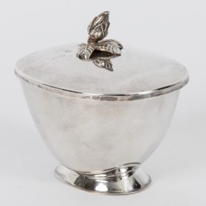 Silberne Deckeldose mit Blumenbekrönung, Deutschland, 20. Jh.90,00 €925/- silver; total weight: approx. 128 g; ovoid lidded box with conically bulging wall on flared base, with removable lid and handle in the form of a stylised rosebud; finial requires tightening, age-related oxidation traces, outer base minimally deformed over approx. 2 cm; tarnish-protected; underside marked with crescent and crown, “Sterling”, unidentified maker’s mark in chalice form and struck fineness mark; height: approx. 9.3 cm.