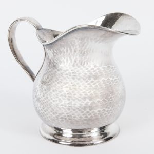 Kleiner Krug mit Hammerschlagdekor, Juwelier Watty, Hamburg, 1. H. 20. Jh.280,00 €835/- silver; total weight: approx. 396 g; jug with bulbous, slightly conical body, broad flared spout and high-set ear handle, on a convex circular base with encircling hammered decoration to the body; age-related oxidation residues and signs of wear, as well as a small nick to the handle of approx. 4 mm; underside marked with crescent and crown, jeweller’s mark and fineness mark; height: approx. 13.1 cm.