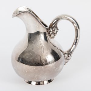 Kleiner Weinkrug, Deutschland, 2. Hälfte 20. Jh.140,00 €925/- silver; total weight: approx. 230 g; jug on a circular foot ring with strongly globular body, high-drawn semi-circular spout and high-set C-shaped handle with stylised, sculptural grape motif at both ends, age-related signs of wear; underside stamped with crescent and crown, two fineness marks and an unidentified maker’s mark; height: approx. 15.2 cm.