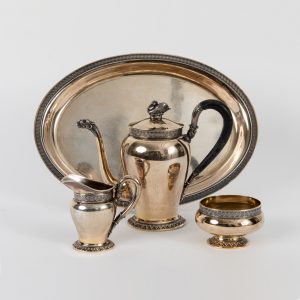 4-teiliges vergoldetes Mokkaservice, Deutschland, 1. Hälfte 20. Jh.680,00 €925/- silver, gilt; total weight: approx. 693 g; four-piece set with encircling floral and ornamental decoration, comprising: 1) mocha pot with pear-shaped body, low-set narrow spout in the form of a mythical creature’s head, side-hinged lid with handle in the form of a sculptural swan, and high-set ear handle made of ebonised wood; height: approx. 14.3 cm. 2) Small cream jug with conically bulging body, broad spout and centrally set ear handle; height: approx. 7.8 cm. 3) Sugar bowl with compressed globular body and drawn-in rim on an ovoid base; height: approx. 4.5 cm. 4) Oval serving tray with raised gallery; dimensions: approx. 27.4 x 19.8 cm. Age-related signs of wear and gilt loss; underside stamped with crescent and crown, fineness mark and consecutive numbering.
