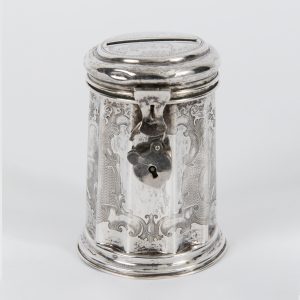 Antike Zuckerdose mit Gravurdekor, London, England, 1803480,00 €Sterling silver; weight: approx. 412 g; ovoid sugar box on a narrow foot ring with raised shoulder, hinged profiled lid at the rear and mushroom-shaped finial; centrally inset keyhole to the front, key missing; encircling border with floral decoration and chased linear ornament to the body, a circular reserve centred on both the front and reverse, the reverse engraved with the Latin motto “NEC TIMERE NEC TIMIDE”; lid with fine encircling chased decoration; age-related signs of wear, lid finial probably later added and showing an irregular depression; lid stamped with lion passant, underside stamped with lion passant, duty mark, London town mark, unidentified maker’s mark and date letter; dimensions: approx. 14.6 x 14.6 x 10.5 cm.